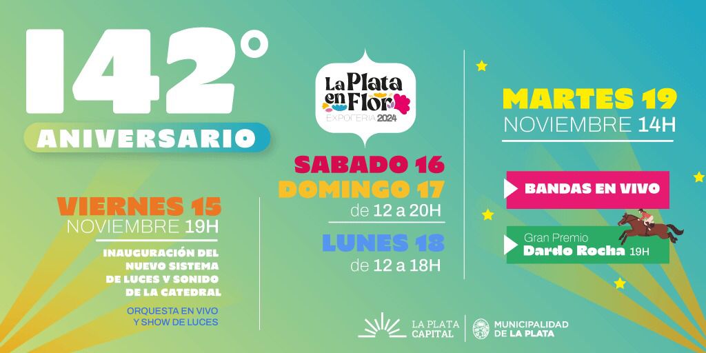 Por otro lado, del sábado 16 al lunes 18 de noviembre, Plaza Moreno será sede de La Plata en Flor 2024, una exposición para celebrar la riqueza florícola de la capital bonaerense que estará abierta al público el sábado y el domingo de 12:00 a 20:00 y el lunes de 12:00 a 18:00.
