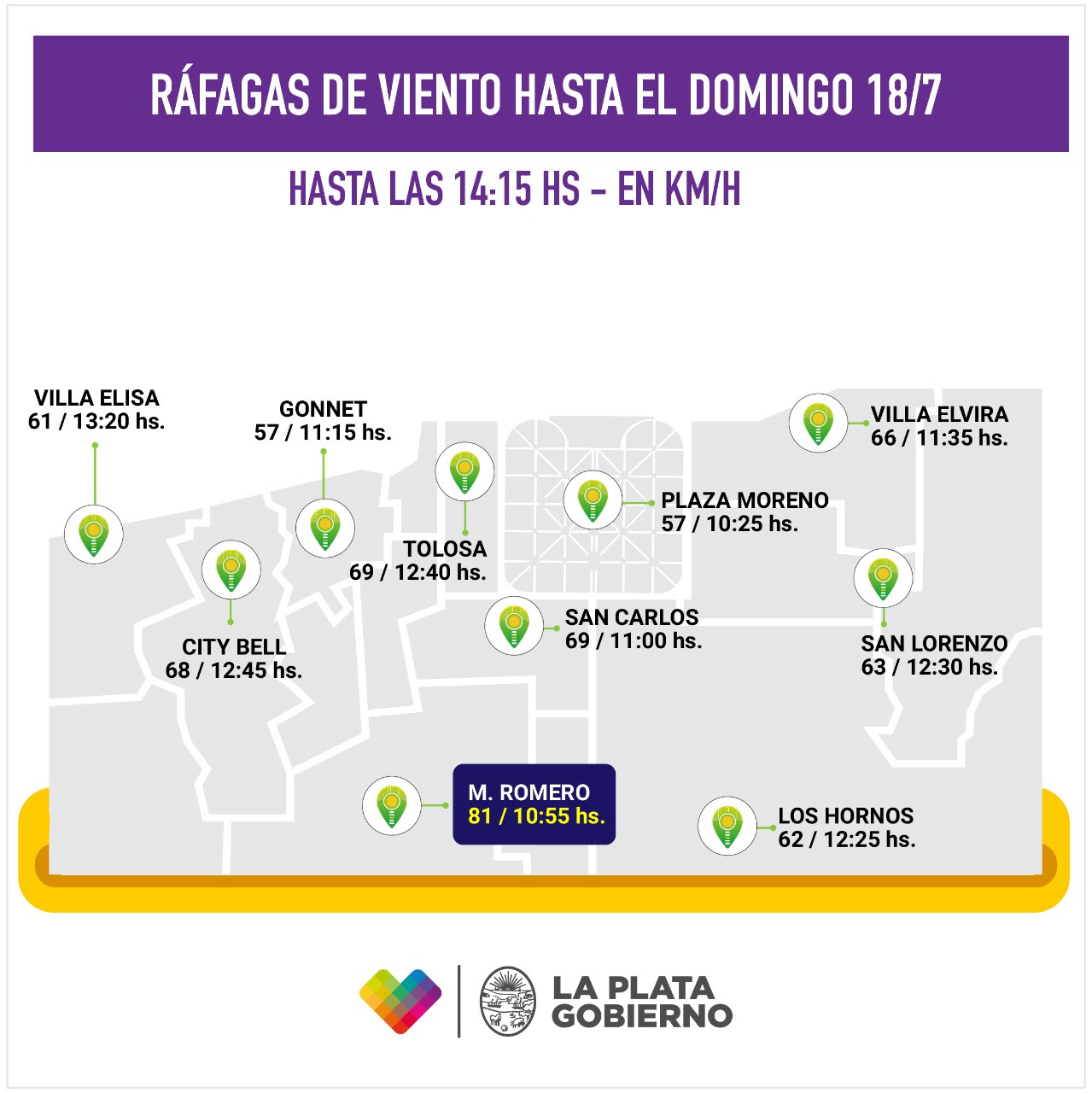 De acuerdo a los datos registrados durante las últimas horas, las ráfagas alcanzaron los 81 km/h en Melchor Romero; en Tolosa y San Carlos llegaron a los 69 km/h; en City Bell se registraron máximas de 69 km/h; mientras que estuvieron por encima de los 50 km/h en el resto de las localidades.