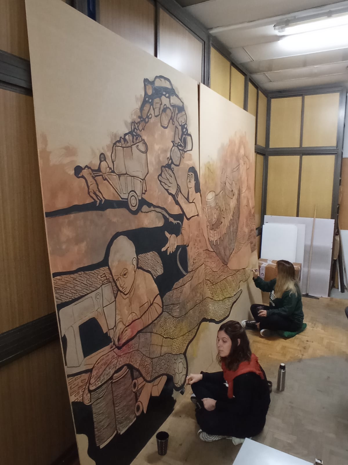 La explicación de la obra continúa: “También se puede observar el trabajo infantil callejero, en donde una niña realiza malabares con naranjas que se transforman en varios elementos, entre los que se destacan: cartones, baldes, secadores, cepillos, botellas y materiales de desecho; todos ellos conducen la mirada a una particular actividad dentro de este tipo de trabajo infantil, que se vincula a la recolección de basura. Ésta última, es representada por un niño que intenta con su cuerpo arrastrar un carro de grandes proporciones en el que también viaja otra pequeña niña”.