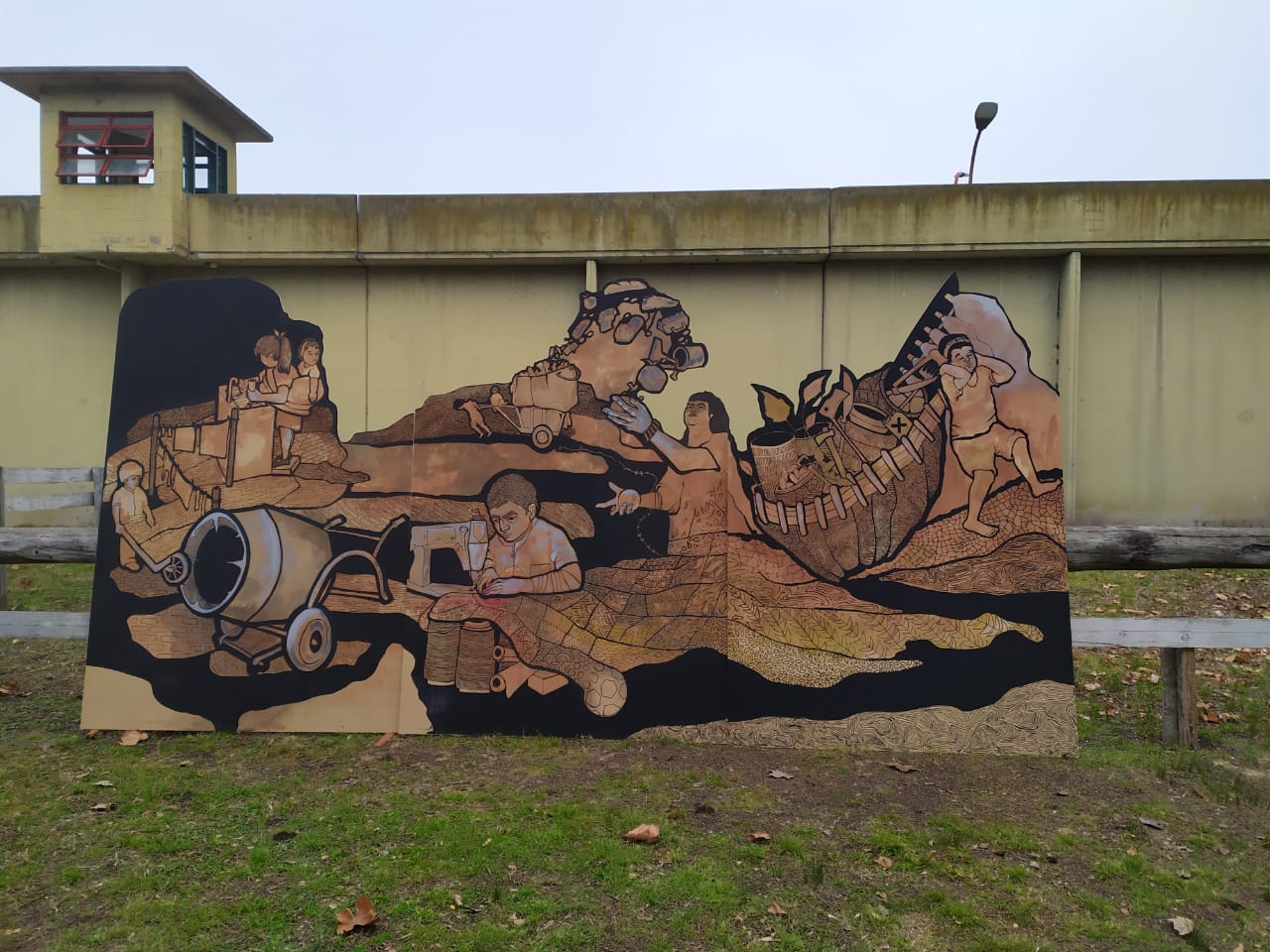 Se trata de una gigantografía de 3 por 6 metros. Colaboraron con dibujos un centenar de personas privadas de libertad de 18 cárceles o alcaidías bonaerenses. Lleva el título “Nada el pájaro y vuela el pez”. Los detalles.