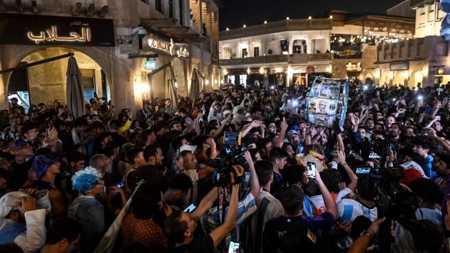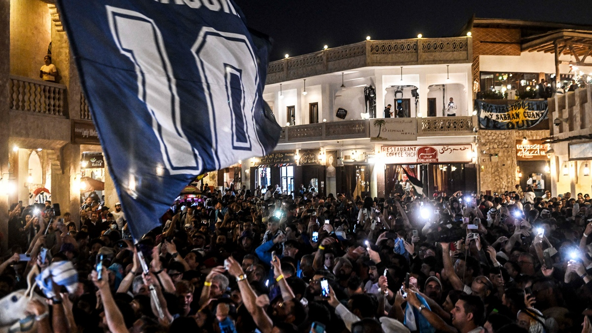 Los fanáticos de la selección argentina cumplieron este lunes con el ritual de antes de cada partido en el Mundial Qatar 2022: el banderazo de apoyo a los jugadores en el tradicional mercado Souq Waqif, uno de los puntos turísticos de la ciudad Doha.