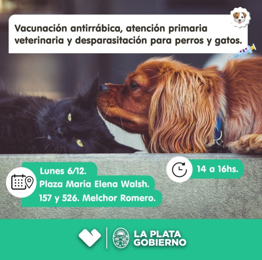 El consultorio móvil veterinario se emplazará en la Plaza María Elena Walsh (157 y 526) de 14 a 16 horas. A este punto podrán acercarse los vecinos con sus perros y gatos, que serán atendidos en forma gratuita y por orden de llegada.