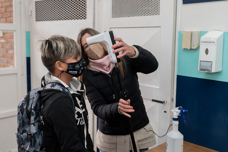 Antes de ingresar cada alumno pasa por un círculo ubicado en piso para desinfectar su calzado. Luego se le toma la temperatura y se le coloca alcohol en gel en las manos. También se desinfectan las mochilas.