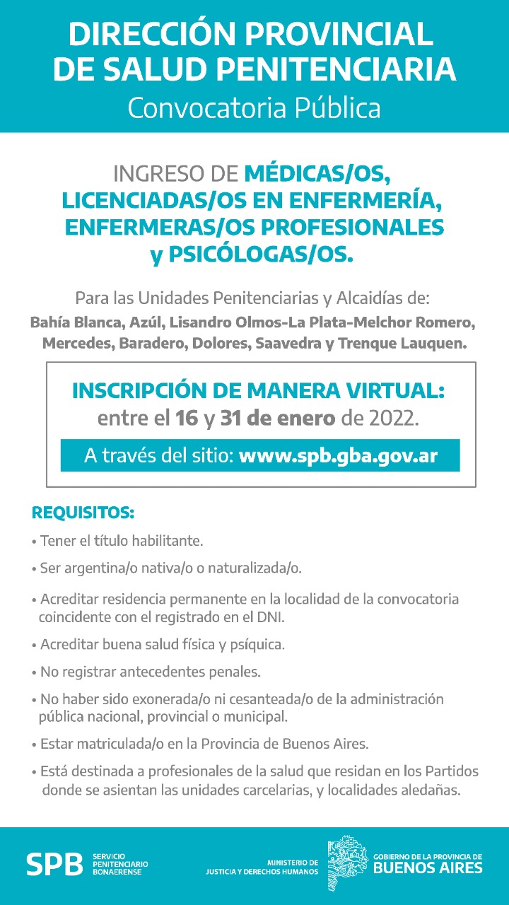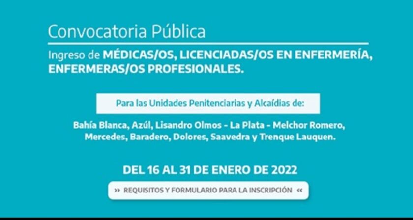 La Dirección Provincial de Salud Penitenciaria de la provincia de Buenos Aires abrió la inscripción para incorporar médicos, licenciados en enfermería y enfermeros profesionales con el objetivo de cubrir vacantes en las Unidades Carcelarias y Alcaidías de Bahía Blanca, Azul, Lisandro Olmos-La Plata-Melchor Romero, Mercedes, Baradero, Dolores, Saavedra y Trenque Lauquen.