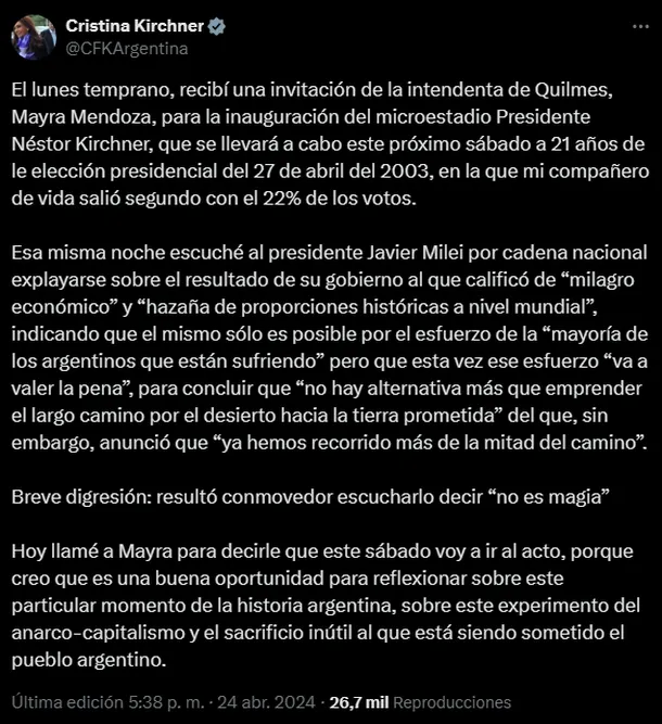 a expresidenta contó: «El lunes temprano, recibí una invitación de la intendenta de Quilmes, Mayra Mendoza, para la inauguración del microestadio Presidente Néstor Kirchner, que se llevará a cabo este próximo sábado a 21 años de le elección presidencial del 27 de abril del 2003, en la que mi compañero de vida salió segundo con el 22% de los votos».