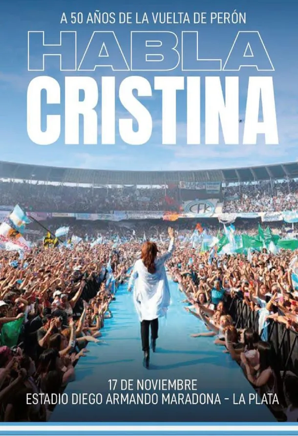 La vicepresidenta Cristina Kirchner encabezará el jueves 17 de noviembre un acto por el Día de la Militancia, con motivo de los «50 años de la vuelta de Perón» del exilio, en el estadio Diego Armando Maradona de La Plata.