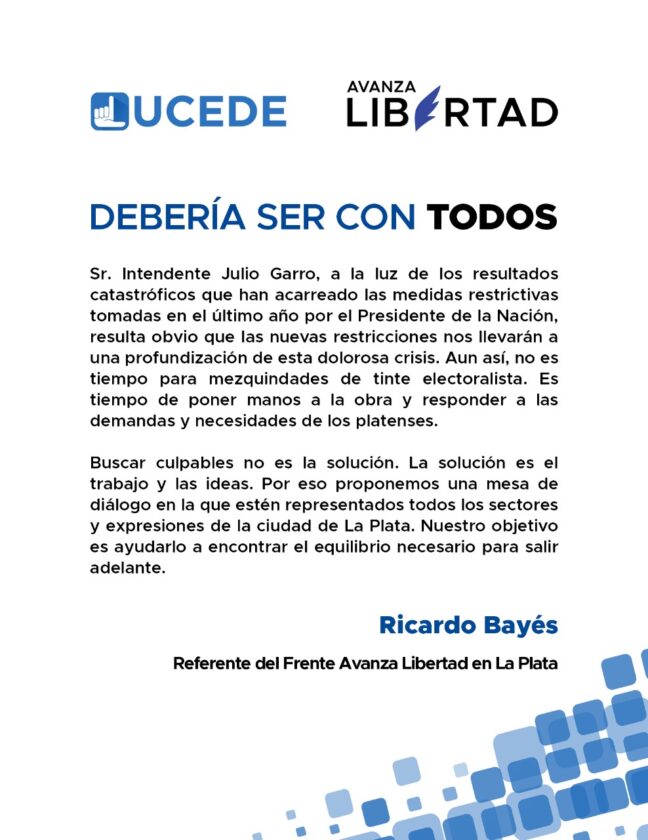 «Debería ser con TODOS» es el título del comunicado firmado por el referente de la UCEDE y Avanza Libertad de la ciudad de La Plata , Ricardo Bayes dirigido al intendente de la ciudad Julio Garro, en el cual propone ser convocados a una mesa de diálogo donde se reflejen todos los sectores y expresiones de la sociedad platense, con la finalidad de encontrar soluciones y alternativas a las restricciones.