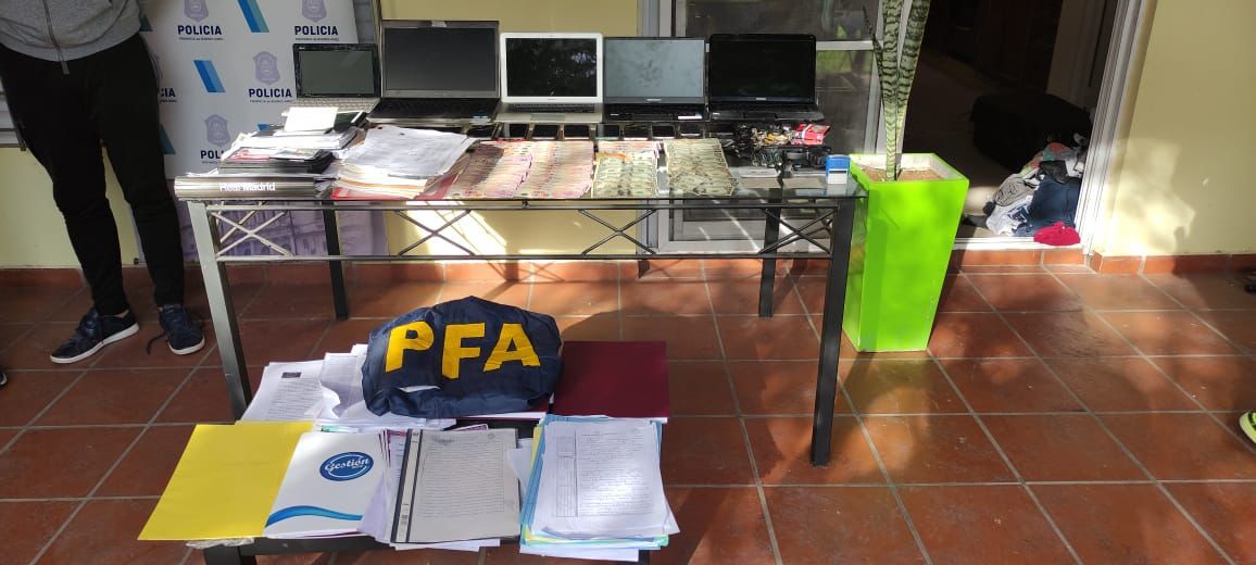 Según la investigación, los agentes federales de la División Investigación Antifraude (PFA) secuestraron una credencial apócrifa de abogado federal, varias ciudadanías europeas, una replica de arma de fuego, 9.400 pesos, 79 dólares, 5 notebooks, 2 tablets y documentación de interés para la causa.