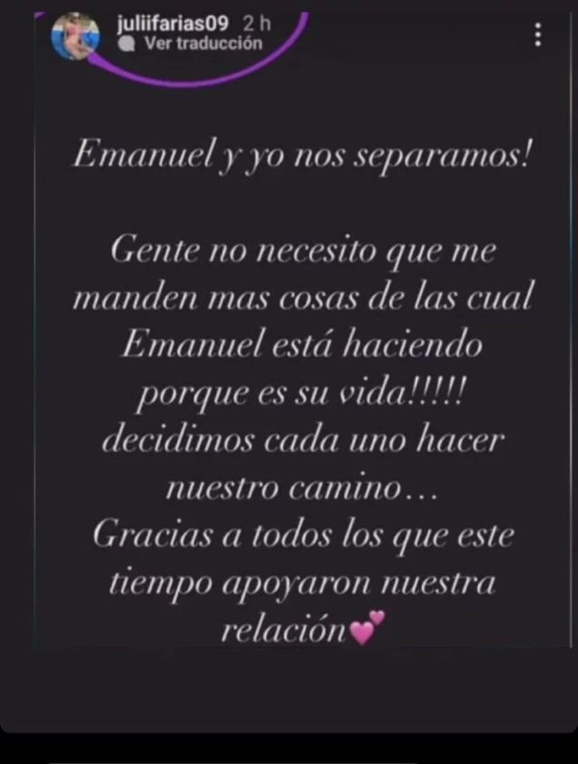 “Emmanuel y yo nos separamos”, comenzó Farías en el texto que escribió entre sus historias y continuó: “Gente no necesito que me manden más cosas de las cuales Emanuel está haciendo, porque es su vida”. Sin profundizar en el tema, la rubia dio a entender que algunas actitudes del líder de Ke Personaje le habrían molestado.