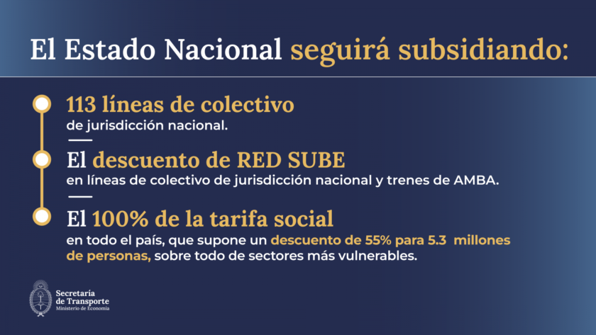 En este sentido, la Nación mantendrá el programa Red SUBE en las líneas de colectivo de Jurisdicción Nacional y en los trenes, a la vez que se sostendrá la Tarifa Social a más de 5.3 millones de personas que pagan el boleto con un descuento del 55% en todo el país.