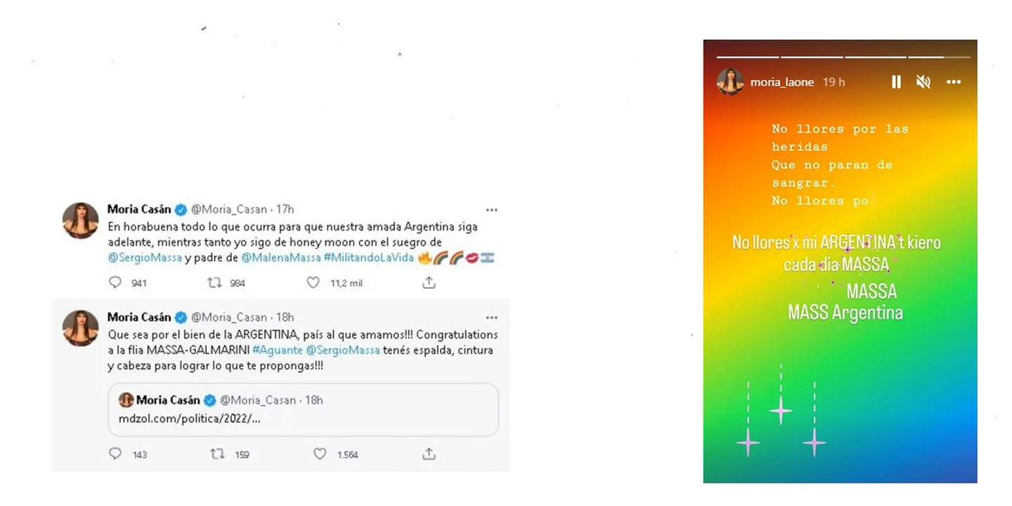 “En hora buena todo lo que ocurra para que nuestra amada Argentina siga adelante”, escribió la diva vía Twitter e Instagram. Y luego, agregó: “Mientras tanto yo sigo de honey moon con el suegro de Sergio Massa y padre de Malena, #Militandolavida”. La one se casó con Galmarini a fines de 2021 y recién ahora pudieron irse de viaje.