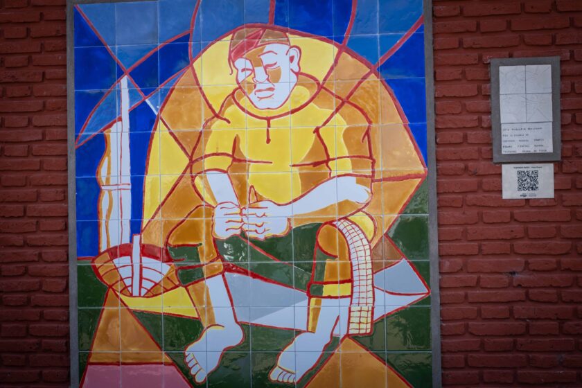 Es una reproducción de la obra «Hombre tejiendo redes», de Ítalo Grassi, realizada en cerámica por estudiantes de la Escuela de Cerámica Rogelio Yrurtia. Se emplazó siguiendo diversas pautas para propender a la accesibilidad. “Cuenta con una placa de descripción en braille, con un mural háptico a escala (para que puedan conocerlo las personas ciegas a través del tacto) y con un recorrido audiovisual a través de un código QR”, precisó Marina Grigera, docente de la Institución.