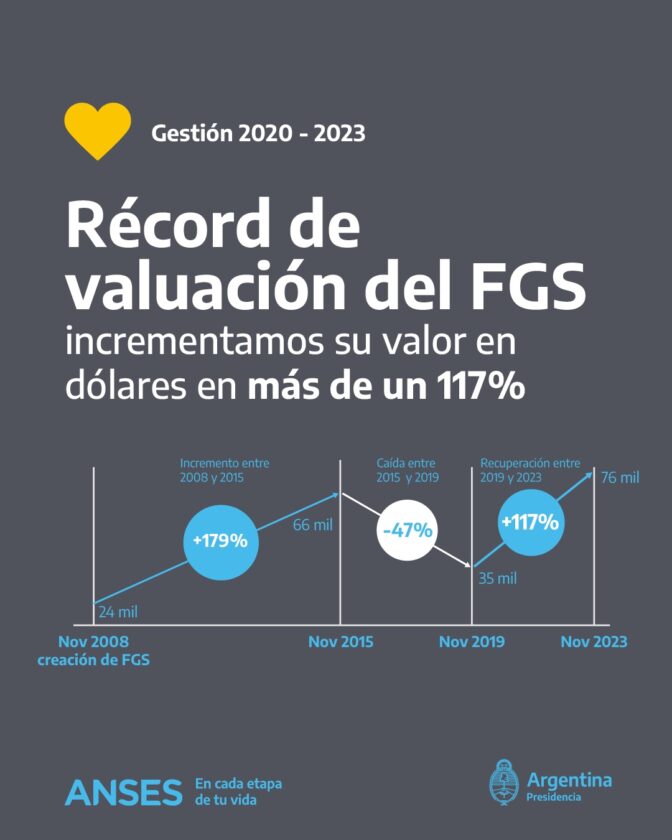 De esta manera, la actual gestión de ANSES, a cargo del FGS, tuvo la mejor valuación de la historia del fondo de inversión y alcanzó una importante recuperación en los proyectos productivos, impulsando el empleo y garantizando un eficaz funcionamiento del Fondo de respaldo del sistema previsional argentino.