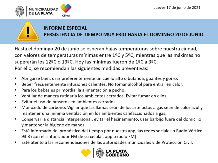 En ese sentido, desde el Municipio recomendaron abrigarse bien, usando preferentemente cuello alto o bufanda, guantes y gorro. También se aconseja beber frecuentemente infusiones calientes, y no tomar alcohol para entrar en calor. Para los bebés es primordial la alimentación a pecho.