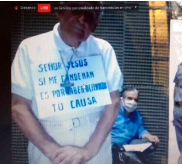 Para escuchar la pena, Etchecolatz se puso de pie y mostró, colgado de su cuello, un cartel blanco con la leyenda: «Señor Jesús, si me condenan es por haber defendido tu causa».