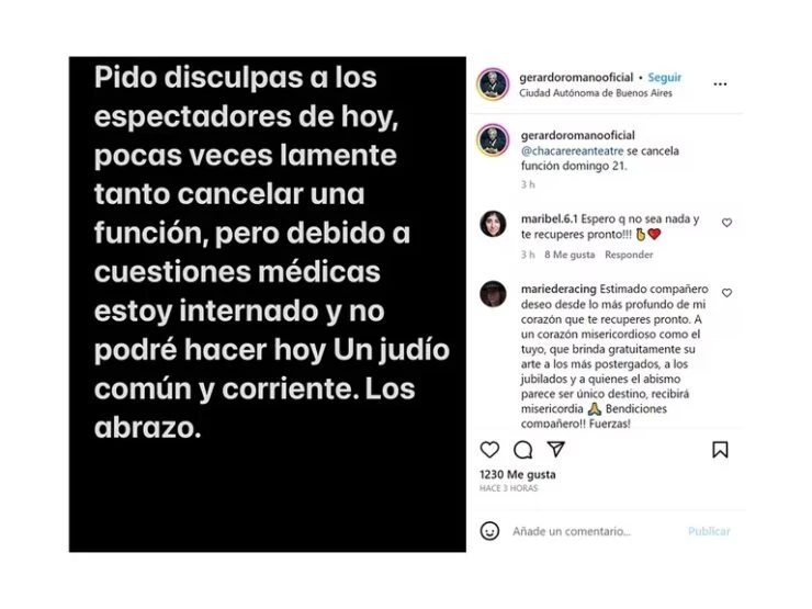 “Pido disculpas a los espectadores de hoy, pocas veces lamenté tanto cancelar una función, pero debido a cuestiones médicas estoy internado y no podré hacer Un judío común y corriente. Los abrazo. Se cancela la función, domingo 21″, compartió Romano en su Instagram.