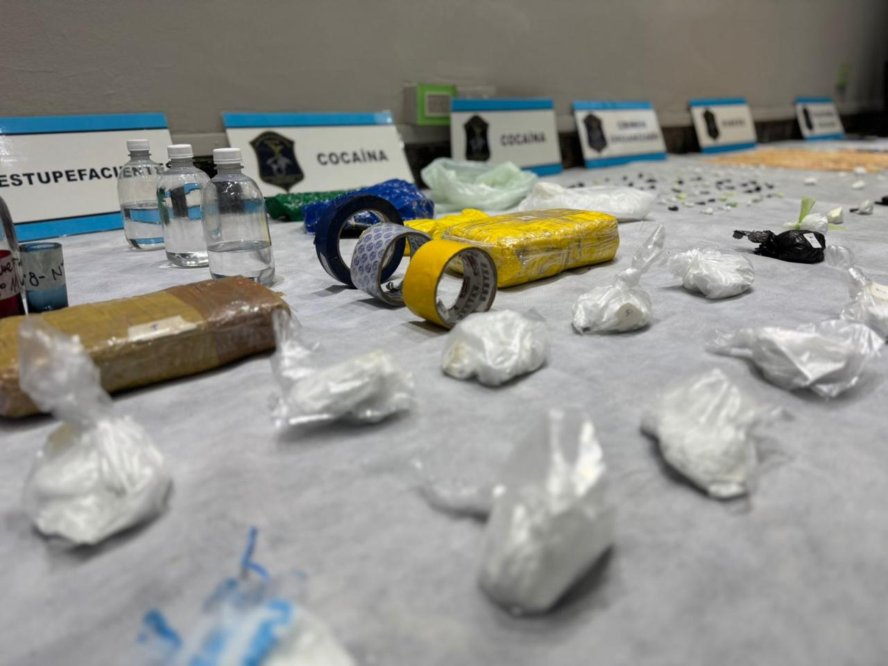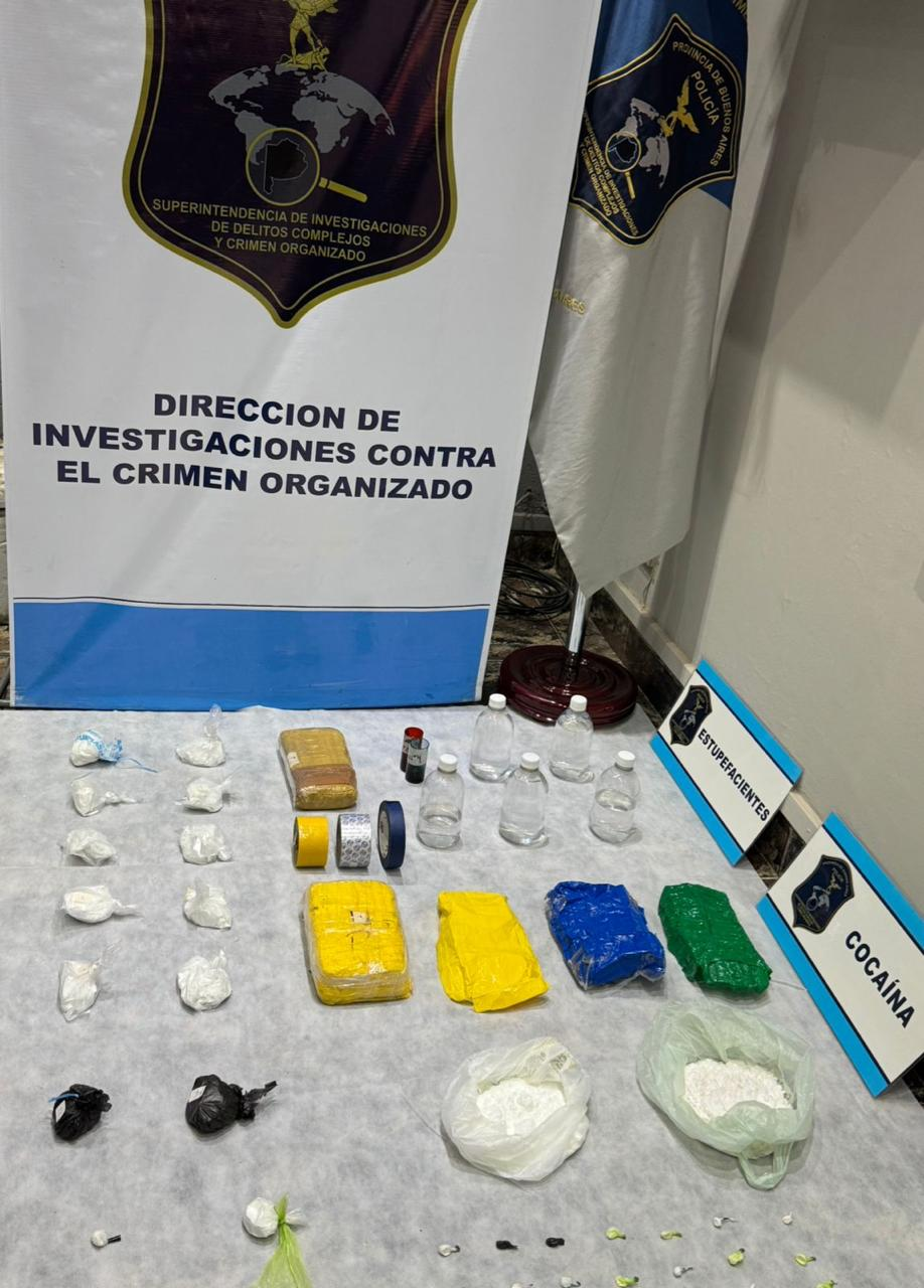 En el operativo se incautaron más de 2.500 gramos de cocaína en distintos formatos —incluido un ladrillo compacto de más de un kilo—, 19 gramos de marihuana, más de un kilo de sustancias de estiramiento y corte, 6 balanzas de precisión, 5 botellas de acetona, un pasaje de avión, 19 teléfonos celulares, dinero en efectivo, un vehículo de alta gama y elementos asociados a la preparación y distribución de estupefacientes.
