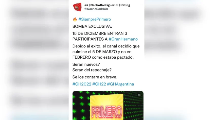 Según el periodista Nacho Rodríguez, la fecha pautada por Telefe para el ingreso de los nuevos concursantes sería el 15 de diciembre. “Debido al éxito, el canal decidió que culmine el 5 de marzo y no en febrero como estaba pactado. ¿Serán nuevos? ¿Serán del repechaje?”, comentó el usuario que deslizó la información.