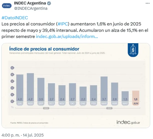 El Instituto Nacional de Estadística y Censos (INDEC) informó este lunes que la inflación de junio fue del 1,6%, acumulando así un 39,4% interanual, en un contexto donde los relevamientos privados ya anticipaban un leve repunte en relación al dato de mayo.