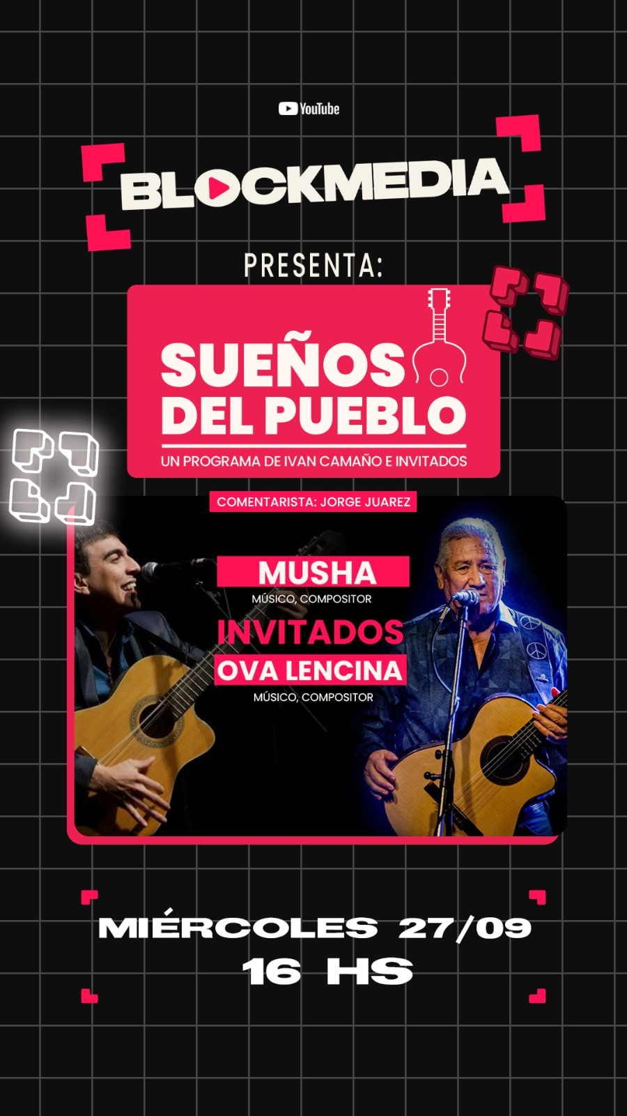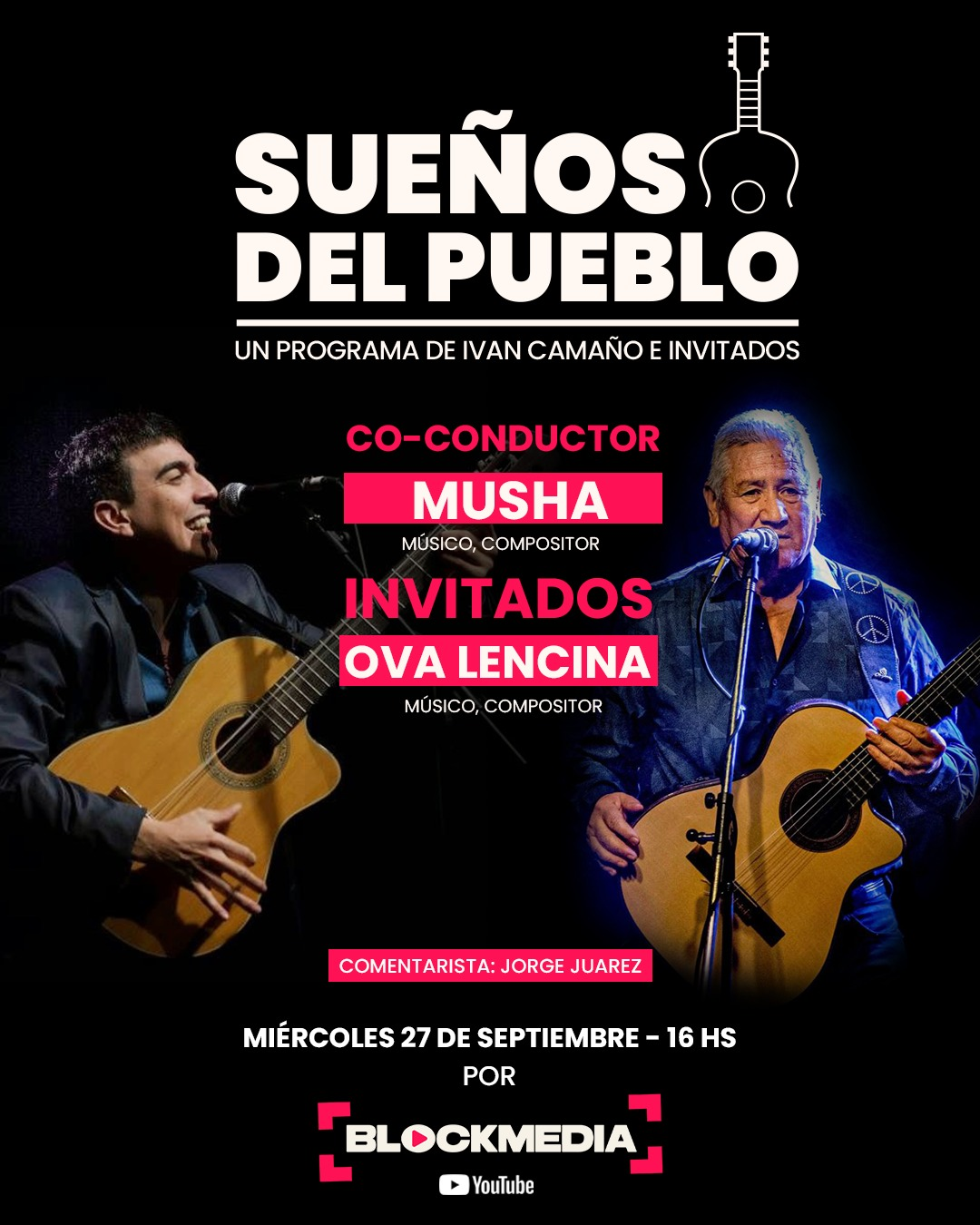 Iván Camaño y Musha Carabajal, dos folcloristas, una misma pasión, la cultura argentina. Todos los miércoles de 16 a 18 horas en el Streaming Block Media, los podes escuchar en Sueños del Pueblo. Iván Camaño con un enorme trabajo territorial, nacido en Quimili, Santiago del Estero y Musha Carabajal integrante del legendario grupo los Carabajal. Estas dos grandes leyendas del folklore difunden y defienden desde este nuevo espacio Sueños de Pueblo por Block Media You tube, nuestra cultura y los valores del nacionalismo, Entrevistas en vivo a carpinteros, docentes, acheros, artesanos, músicos invitados en vivo. Está iniciativa fue creada por Iván Camaño con el fin de dar a conocer a nuestra Argentina profunda, no solo desde la música sino también sumando segmentos de salud, educación, deportes y actualidad. El streaming argentino que nació para revolucionar la cultura argentina desde el interior de nuestra tierra.