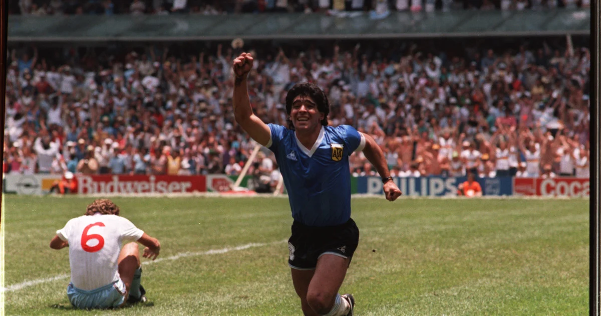 Con esa camiseta azul con el número 10, Maradona le hizo los dos tantos a Inglaterra. El primerio golpeando el balón con la manos superando la salida del arquero inglés Peter Shilton y el 2-0 con una gran jugada en la cual eliminó a cinco defensores ingleses en el gol que fue elegido en 2002, en una votación de la FIFA, como «el gol del siglo».