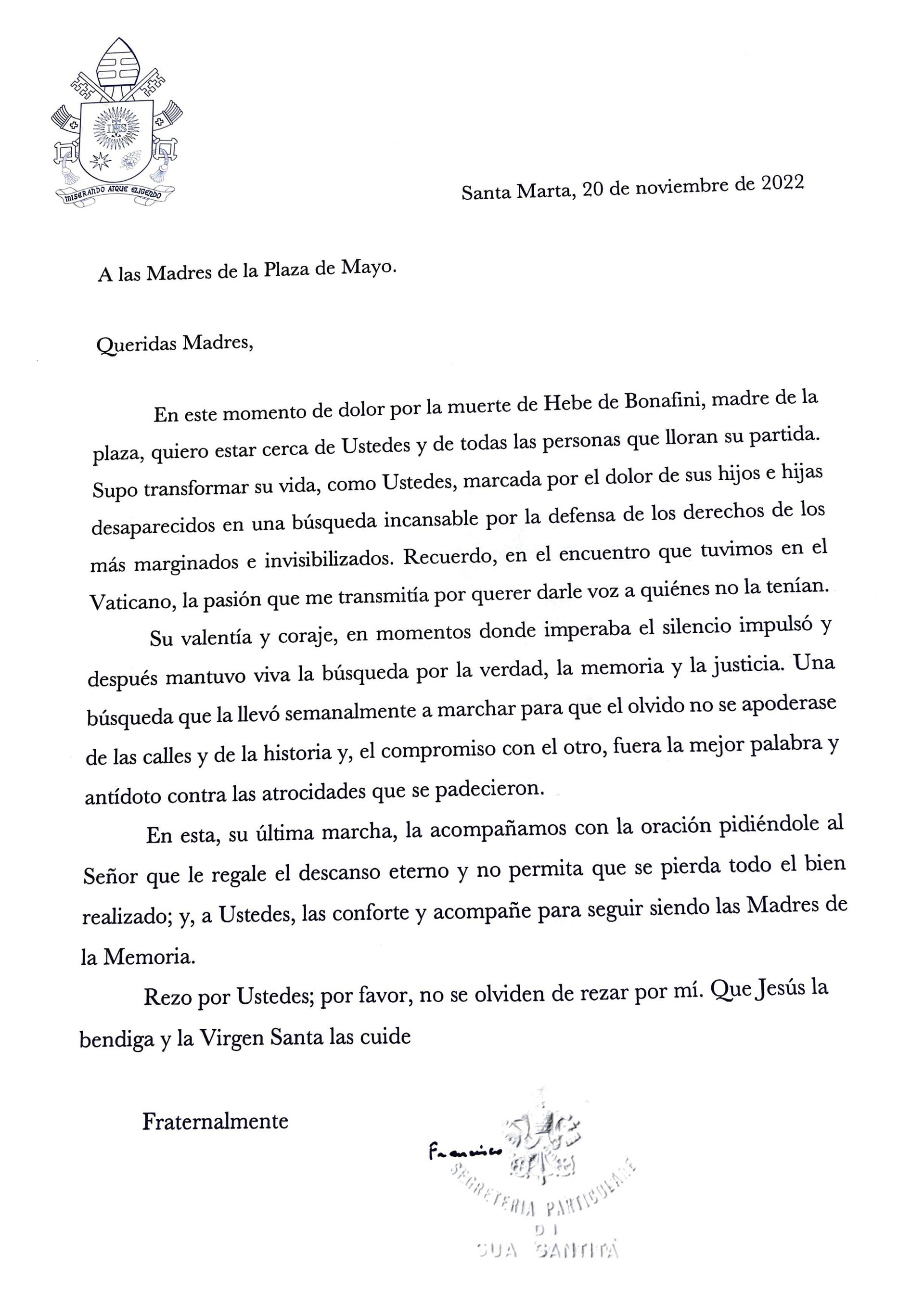 En el texto, encabezado con un «Queridas Madres», Francisco expresó: «En este momento de dolor por la muerte de Hebe de Bonafini, madre de la plaza, quiero estar cerca de ustedes y de todas las personas que lloran su partida. Supo transformar su vida, como ustedes, marcada por el dolor de sus hijos e hijas desaparecidos en una búsqueda incansable por la defensa de los derechos de los más marginados e invisibilizados».