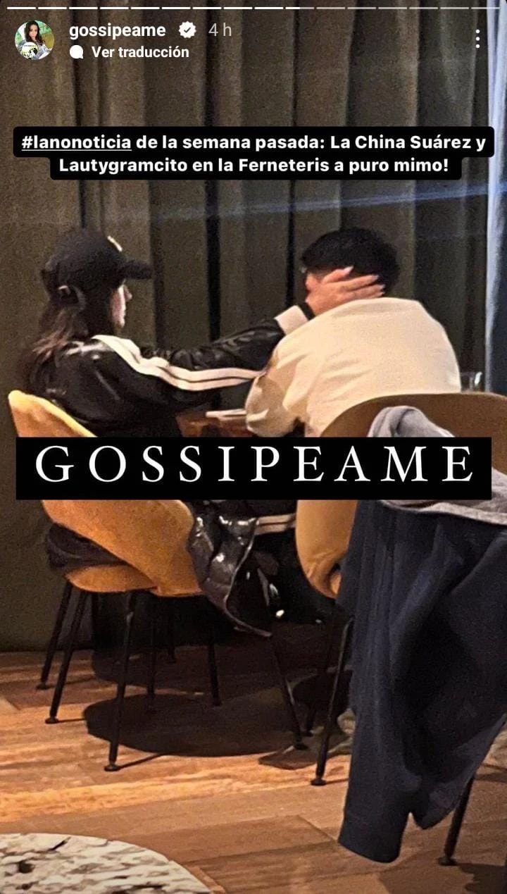 “La China Suárez y Lautygramcito en La Fernetería a puro mimo», comentó la periodista. Mientras ella le tomaba la cara y le hacía una caricia, a Gram se lo notaba muy enamorado de la artista, a quien no dejaba de mirar.