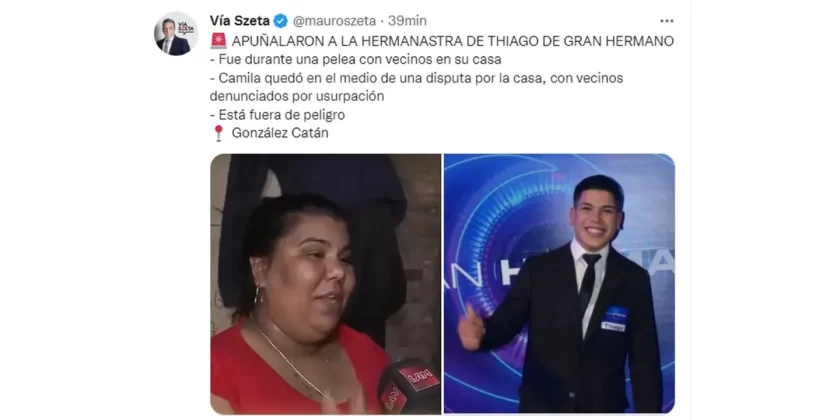 “Apuñalaron a la hermanastra de Thiago de Gran Hermano. Fue durante una pelea con vecinos en su casa. Camila quedó en el medio de una disputa por la casa, con vecinos denunciados por usurpación”, contó el periodista, lo que provocó una catarata de comentarios.