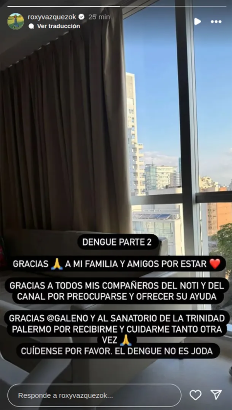 “Dengue parte 2. Gracias a mi familia y amigos por estar. Gracias a todos mis compañeros del noti y del canal por preocuparse y ofrecer su ayuda”, público en Instagram.