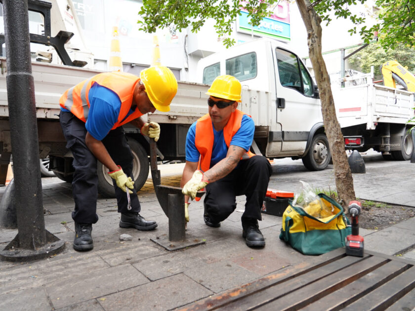 Las tareas también contemplan la restauración de los bancos y los maceteros, el reemplazo de los cestos de basura, la reconstrucción de los recuadros de las cazoletas con cordón de hormigón armado y la plantación de Sabias Pallidas.