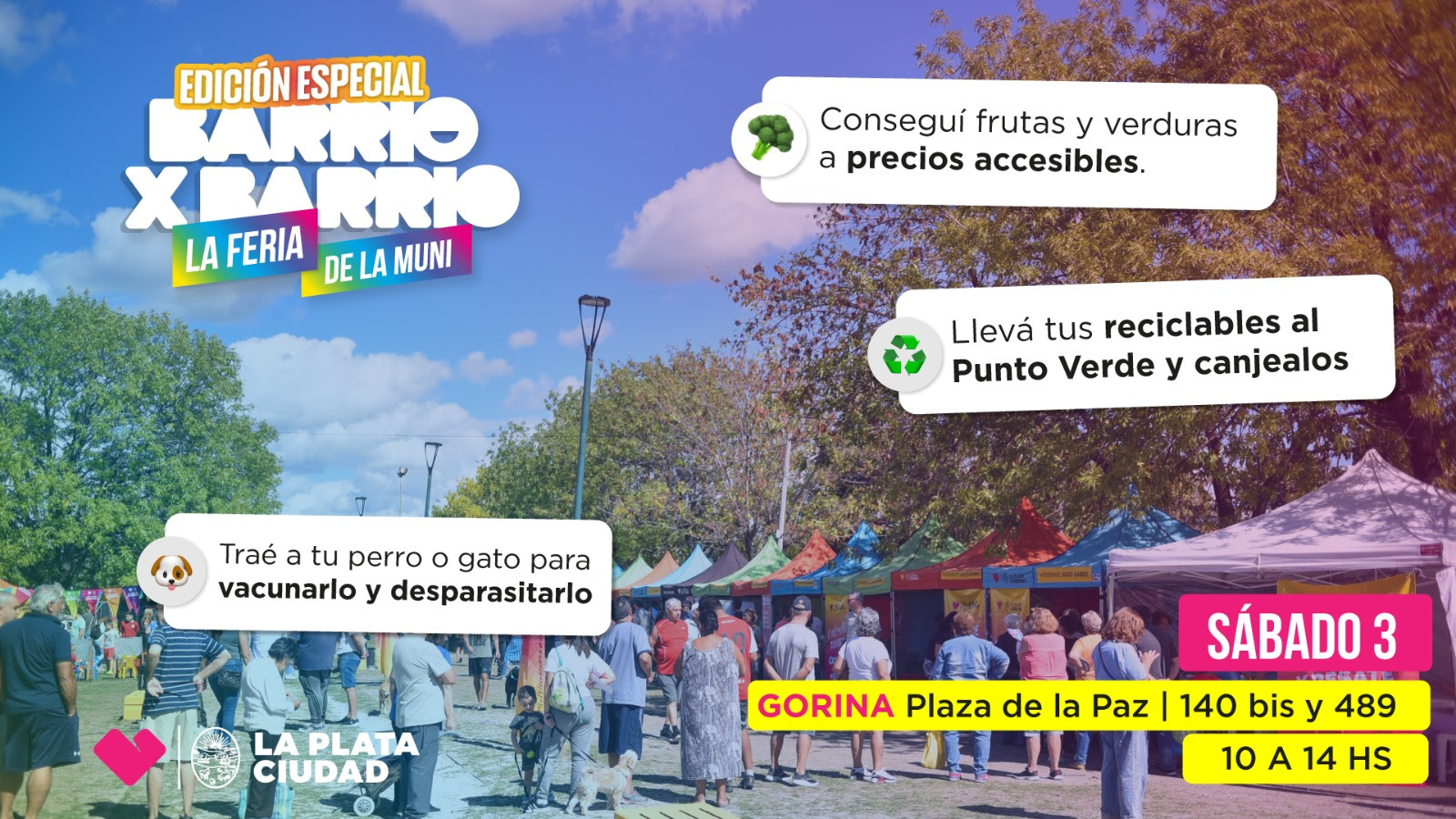 El mismo sábado, la Comuna instalará las postas de ‘Barrio x Barrio’ de 10:00 a 14:00 con atención veterinaria gratuita, vacunación, cortes de pelo sin cargo, talleres ambientales, clases de RCP, asesoramiento en trámites y más servicios municipales.