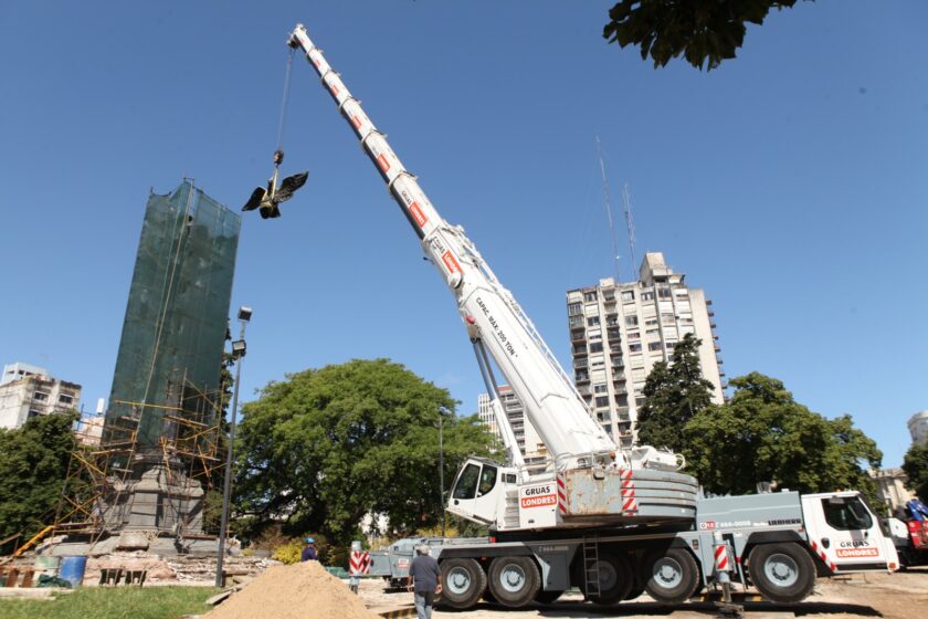 En esta oportunidad, los trabajos demandaron la intervención de más de 20 operarios, una grúa de 200 toneladas y camiones. La escultura fue trasladada hacia un cerco perimetral especialmente montado en el lugar, donde comenzará la restauración y su posterior ensamble nuevamente en su lugar original.