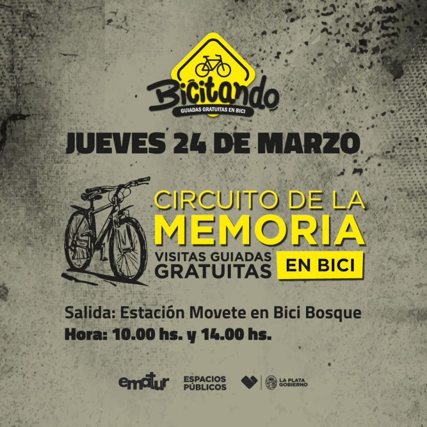 Con motivo de conmemorar el “Día Nacional de la Memoria por la Verdad y la Justicia”, la Municipalidad de La Plata invita a participar del “Circuito de la Memoria”, un recorrido guiado en bicicleta que tiene como objetivo conocer, descubrir y resignificar los espacios de la ciudad marcados por la dictadura cívico militar.