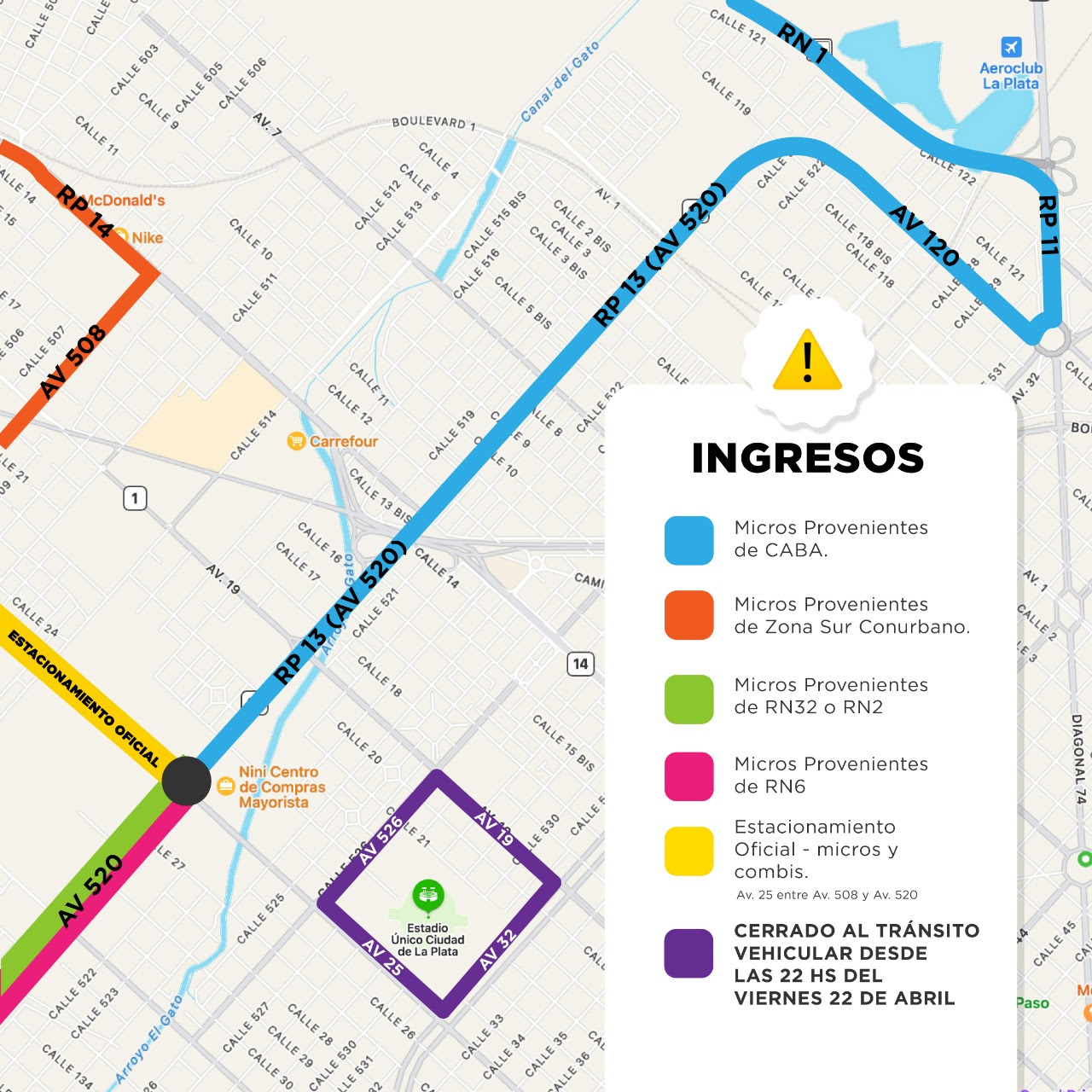 En cuanto a los ingresos, los colectivos y combis que vengan del Gran Buenos Aires o desde CABA por Camino Centenario, deberán desviarse en 508 hacia Avenida 520, y tomar esta última hasta 25.