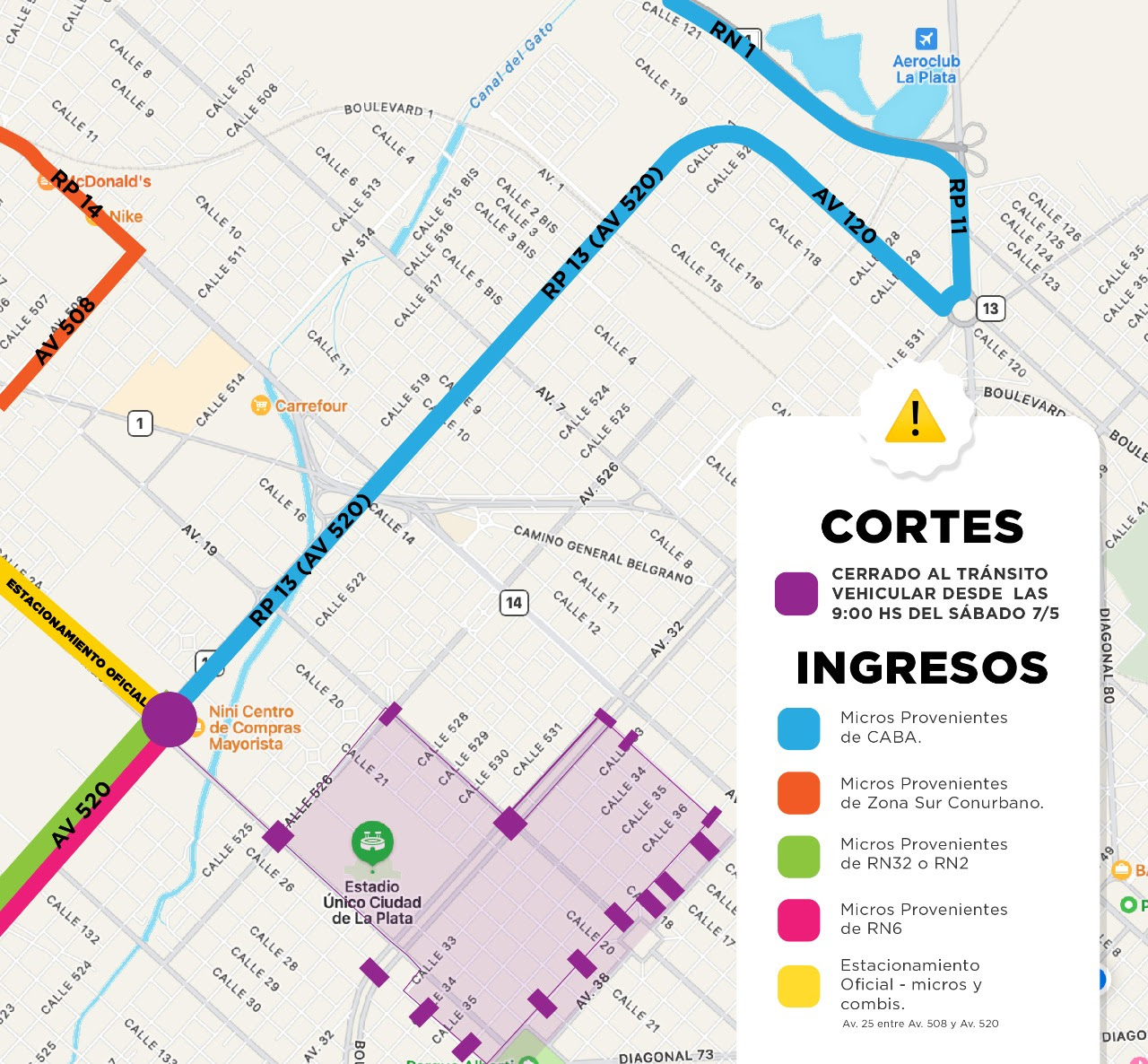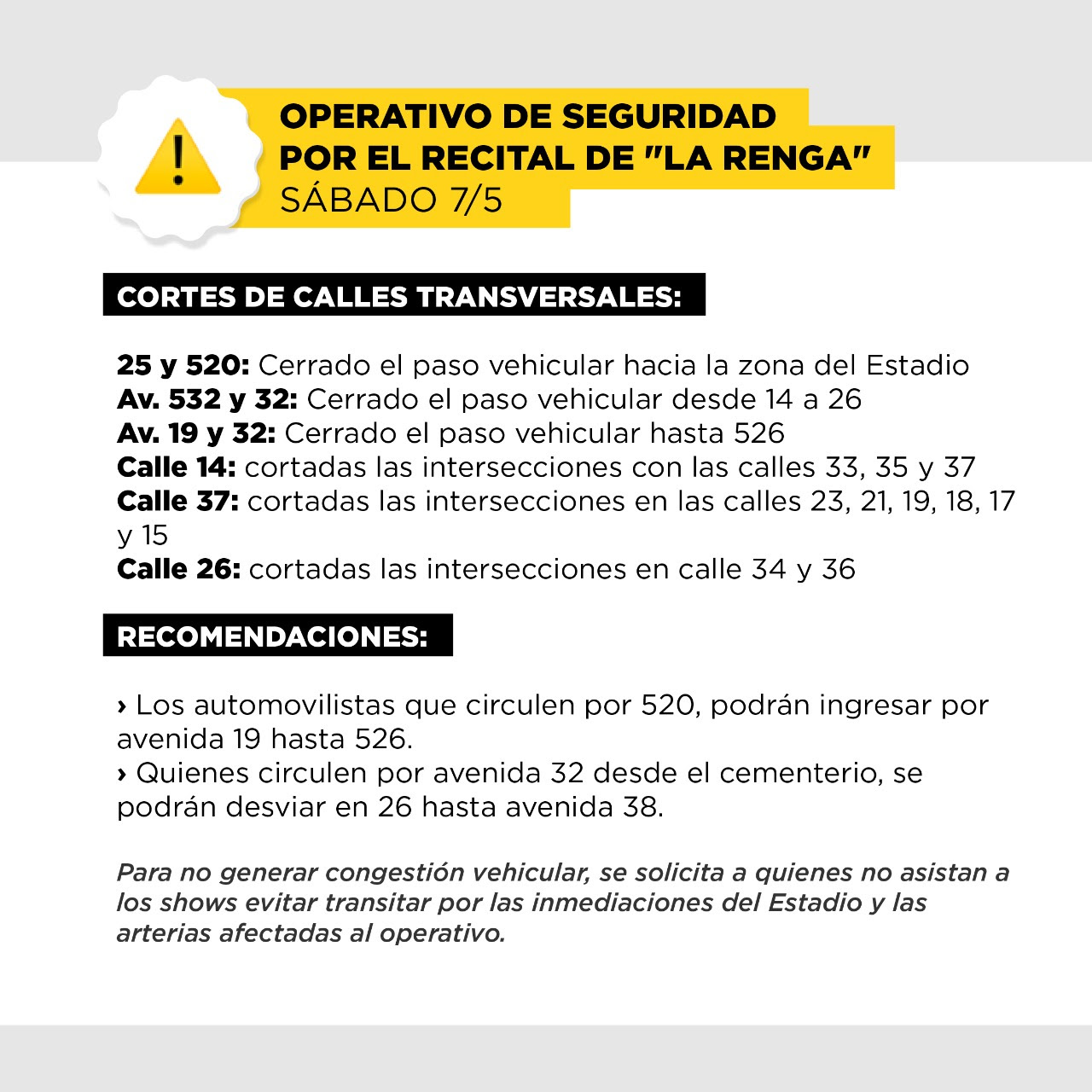 En cuanto a los cortes, se informó que quedará cerrado el paso vehicular hacia la zona del Estadio en Avenida 25 y 520. También estará restringida la circulación en las Avenidas 32 y 532, de calle 14 a 26. A su vez, estará cerrado el paso vehicular sobre Av. 19 hasta 526.