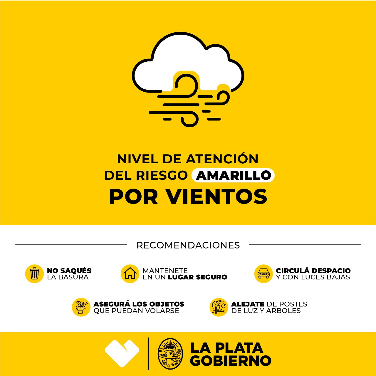 La Municipalidad de La Plata elevó a ‘Amarillo’ el Nivel de Atención del Riesgo por tiempo ventoso con ráfagas que llegarán a la ciudad entre la medianoche y la mañana del viernes. Inician las tareas de prevención y monitoreo de las condiciones climáticas.