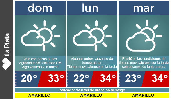 «Hasta el martes 17 inclusive, la Ciudad de La Plata estará bajo la influencia de una masa de aire caluroso que favorecerá la ocurrencia de temperaturas mínimas entre 21ºC y 23ºC, y máximas entre 32ºC y 34ºC, lo que traerá aparejado cierta incomodad térmica», informó la Dirección de Hidrometeorología de la Comuna.
