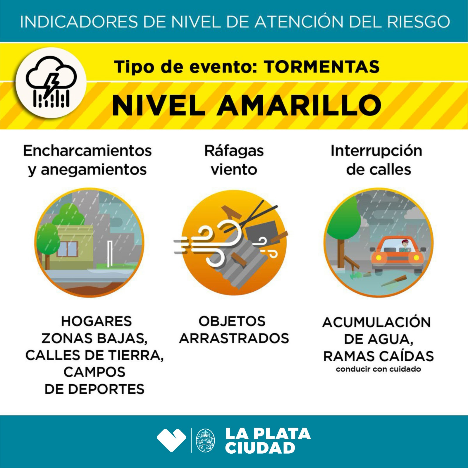 La Municipalidad de La Plata elevó a ‘Amarillo’ el Nivel de Atención del Riesgo (NAR) por tormentas de variada intensidad, con posibilidad de ráfagas y ocasional caída de granizo. Disponen tareas de prevención y el monitoreo de las condiciones climáticas.