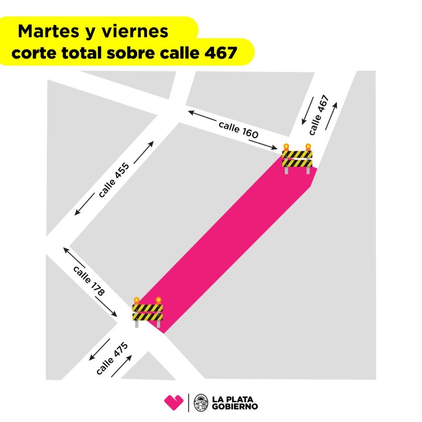 En tanto, “con motivo de materialización de dos cruces pluviales en el marco de obras de construcción de una rotonda, los días martes y viernes, dentro de la franja horaria entre las 7  y las 15:30 horas, se procederá al corte total de calle 467 entre calles 160 y 178”.