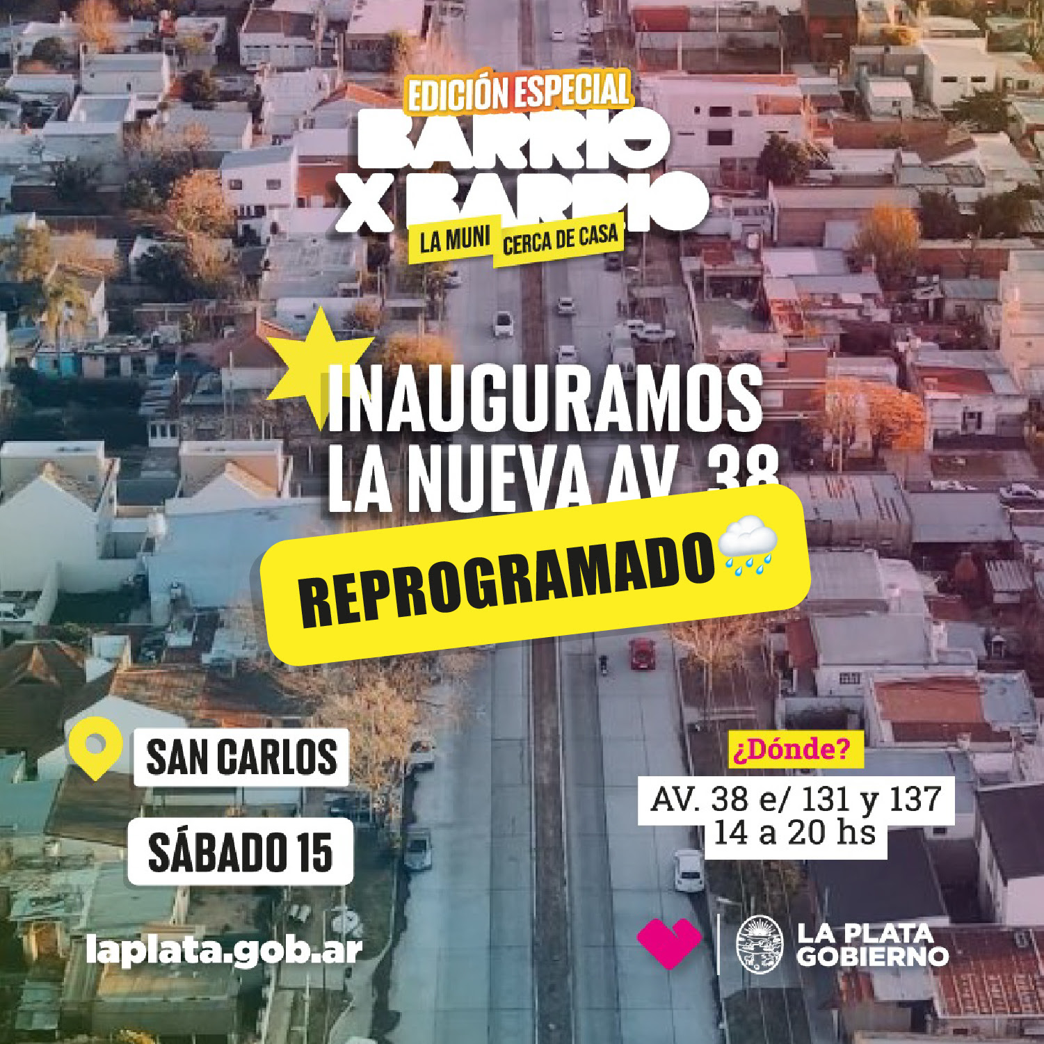La Municipalidad de La Plata informó que ante las precipitaciones que se registran en la ciudad, se reprogramó la edición especial de ‘Barrio x Barrio’ diagramada para este sábado en San Carlos.