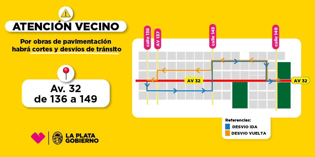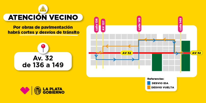 En virtud de las tareas que se están ejecutando en Av. 32, que incluyen pavimento, luminarias, semáforos, desagües y espacios verdes, la Municipalidad de La Plata anunció cortes y desvíos en dicha arteria desde 136 a 149. Habrá cambios en el trayecto de las líneas Oeste y 506.