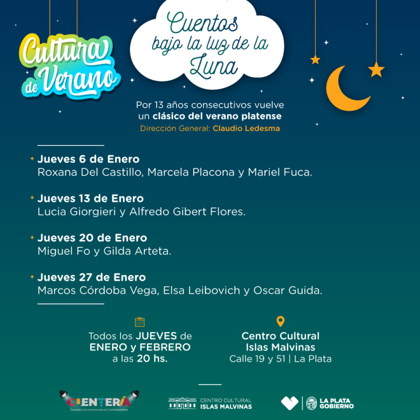 En el marco de las propuestas por la temporada estival, la Municipalidad de La Plata invita a disfrutar de una nueva edición de “Cuentos bajo la luz de la luna”, el ciclo de relatos orales que se desarrollará todos los jueves en el Centro Cultural Islas Malvinas.