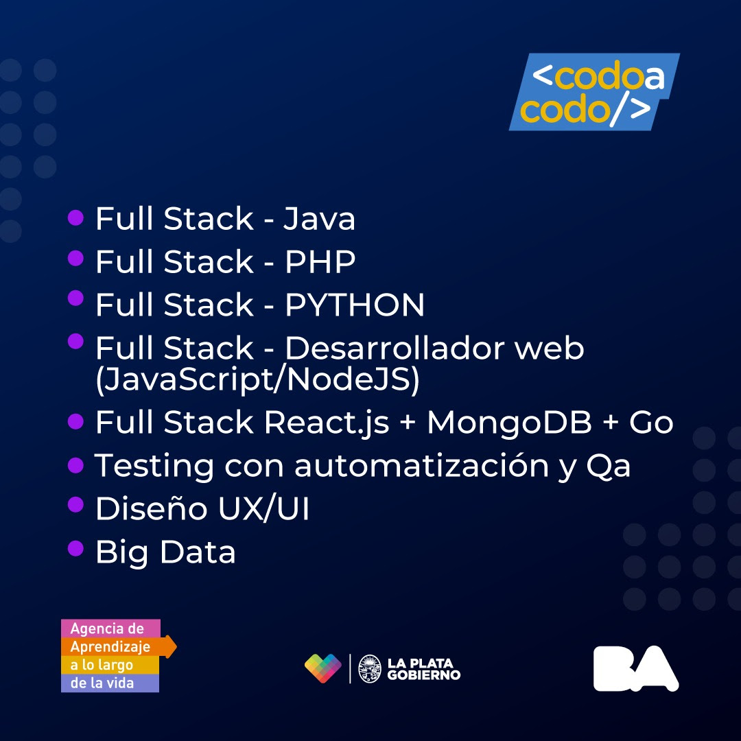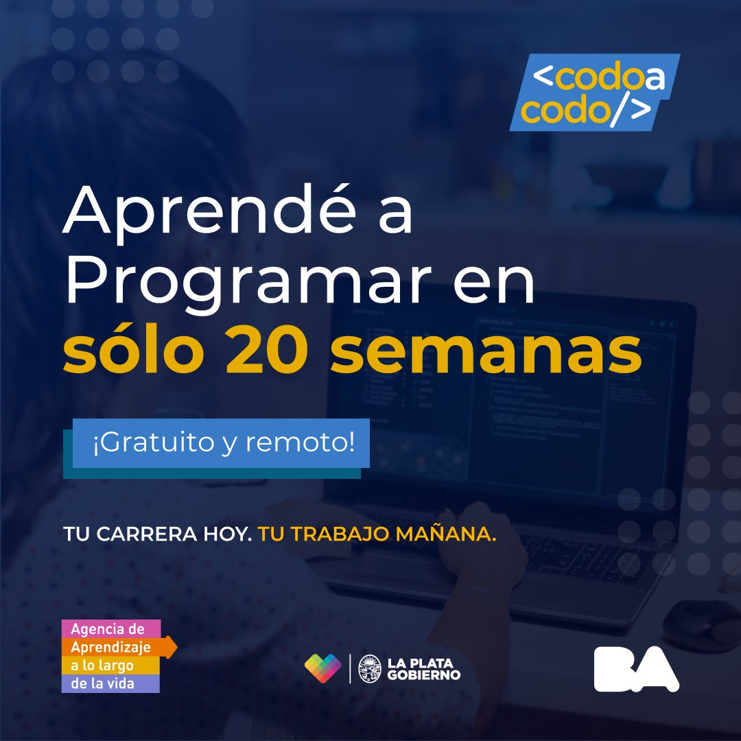 La Municipalidad de La Plata y el gobierno de la Ciudad Autónoma de Buenos Aires (CABA) invitan a participar de “Codo a Codo 4.0 – 2022”, un curso intensivo, gratuito y remoto de Programación Full Stack dirigido a personas con conocimientos previos que busquen ampliar sus oportunidades laborales.