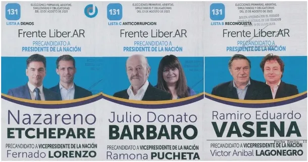 La interna del espacio Liber.ARpresentó tres propuestas:Nazareno Etchepare – Fernando Lorenzo;Julio Bárbaro – Ramona Pucheta; y Ramiro Eduardo Vasena – Víctor Aníbal Lagonegro