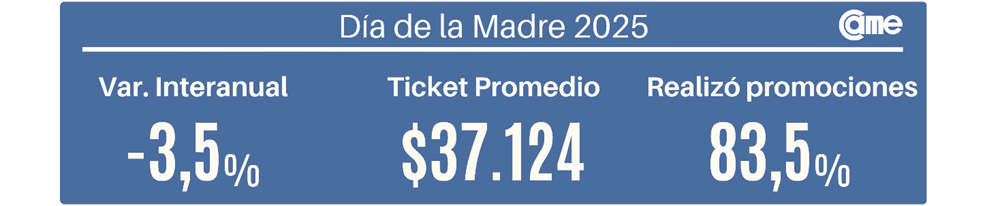 Las ventas en los comercios minoristas pymes durante el Día de la Madre mostraron una retracción del 3,5% frente al mismo período del año anterior, medidas a precios constantes. Se trata del cuarto descenso interanual consecutivo, asociado al deterioro del poder de compra de los hogares y a una fecha que, en la actualidad, no logra impulsar de manera significativa el consumo minorista.