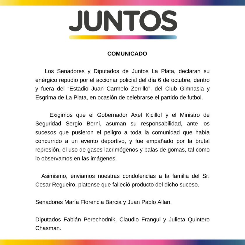 Los Senadores y Diputados de Juntos La Plata, declaran su enérgico repudio por el accionar policial del día 6 de octubre, dentro y fuera del “Estadio Juan Carmelo Zerrillo”, del Club Gimnasia y Esgrima de La Plata, en ocasión de celebrarse el partido de fútbol.