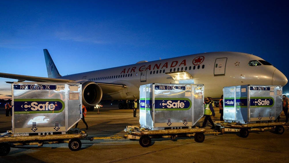 El vuelo AC7326 de Air Canada procedente de Toronto aterrizó esta mañana en el aeropuerto internacional de Ezeiza a las 6.45 con una carga en sus bodegas de 2.148.600 dosis que fue recibida en la estación aérea por el jefe de Gabinete Santiago Cafiero y la ministra de Salud Carla Vizzotti.