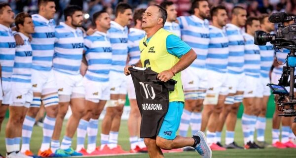 En ese contexto, previo a la tradicional danza se vivió un emotivo momento en el Mc Donald’s Jone Stadium, de Newcastle, cuando el capitán de los All Blacks, Sam Cane, se encaminó directamente hacia la formación del equipo argentino y apoyó sobre el césped una camiseta del equipo neozelandés con el número 10 y el nombre de Maradona.
