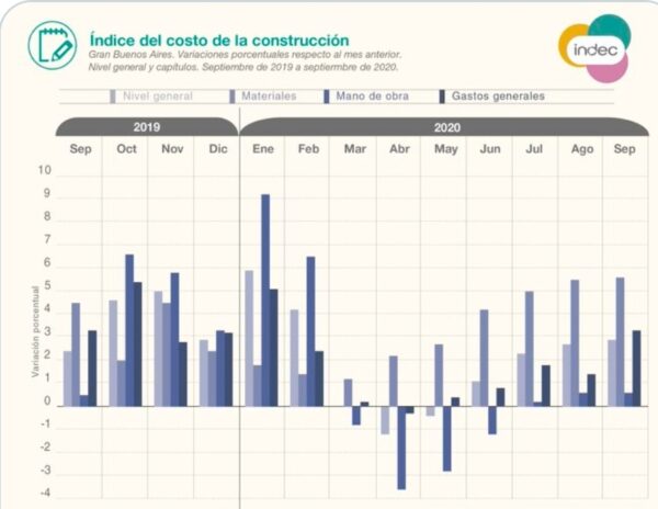 El Indec informó además, que el costo de la construcción avanzó 2,9% en septiembre con una suba del 5,9% en el precio de los materiales, del 3,3% en los gastos generales, y del 0,6% en la mano de obra.
