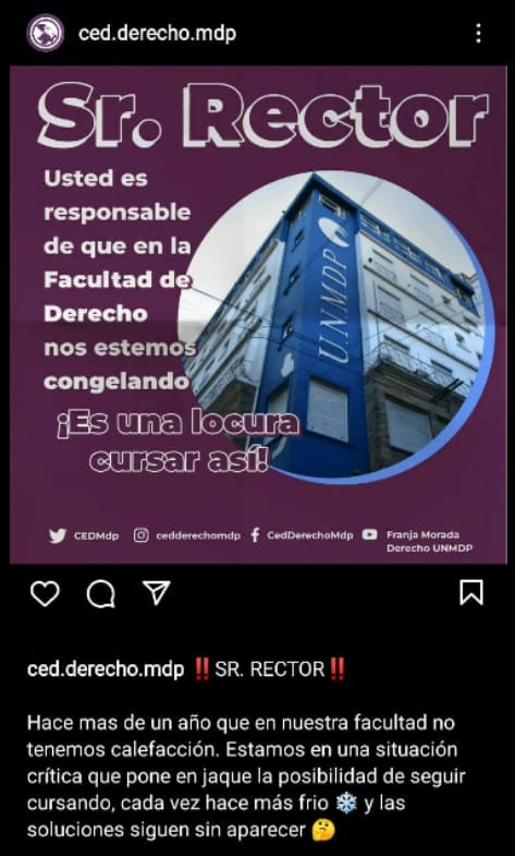 “Queremos que se garanticen los derechos de los estudiantes, y en este marco, lo único que podemos garantizar es que la gestión de la Facultad y del Centro de Estudiantes esta acéfala. Se está atentando contra los derechos de los estudiantes, pero somos una oposición constructiva, por eso ofrecemos soluciones y pedimos que las clases vuelvan a realizarse virtuales para todas las materias hasta que la calefacción sea arreglada”.